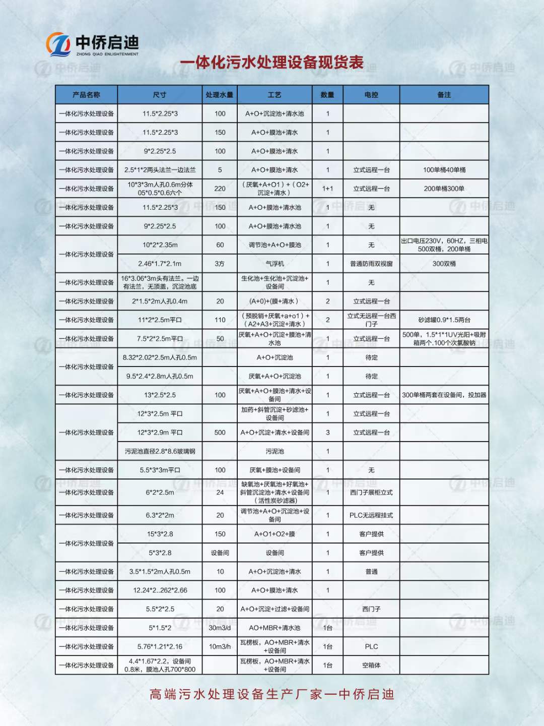一體化污水處理設備具有技術性能穩定可靠,處理效果好,投資省,占地少,維護方便等優點,是很多人購買污水處理設備的首選,有些朋友急需購買設備時,可以看看中僑啟迪一體化污水處理設備現貨,解決您的燃眉之急。 一體化污水處理設備現貨一體化污水處理設備適用住宅小...【點擊詳情】